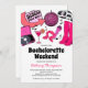 Invitaciones a una fiesta de soltera de vaquera espacial que incluyen una selección de artículos de color rosa retro como una bola de disco, un jugador de discos, botas de vaquera, micrófono, cócteles y un gorra de rodeo, además de una moderna plantilla de soltera divertida que es fácil de personalizar, incluyendo un itinerario de fin de semana en la parte trasera.