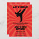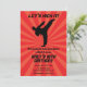 ¡Vamos a patearlo! Esta divertida invitación cuenta con un fondo rojo de estallido y una silueta de karate pateando. Perfecto para la fiesta de cumpleaños de karate de su hijo.