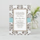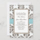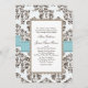 Personalizar esta encantadora y elegante invitación a bodas adamascadas antiguas de color azul y marrón oscuro, ligeramente perturbadas, con un diseño de contraste de cinta azul y marrón. Diseño © Chrissy H. Estudios, LLC.Todos Los Derechos Reservados.
