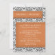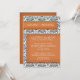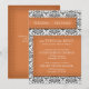 Invitaciones modernas y modernas para su Boda. Presenta un diseño/ilustracion de costura naranja sobre un patrón de damasco blanco y negro. En la parte posterior (opcional) se puede imprimir información, instrucciones o detalles adicionales.