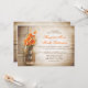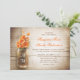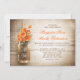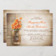 bellas invitaciones caseras rústicas con fondo de madera angustiada y tarro de albañil con flores de color naranja. Sugiero un hermoso papel de textura de lino para este diseño.