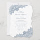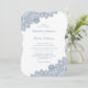 Elegantes invitaciones de bodas de color azul polvoriento vintage con un polvoriento encaje floral azul y un elegante tipo de letra de guión. Personalice fácilmente estas polvorientas tarjetas bodas azules con los detalles de su boda.