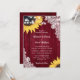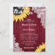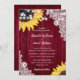 Esta invitación floral a la boda con girasoles en un fondo de madera granero adornado con luces de cuerda y encaje floral blanco es perfecta para invitar a sus invitados a su rústica fiesta de bodas rojas burdeos inspirada en los girasoles. Plantilla fácil de personalizar. Diseño de personalizable completo.