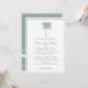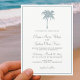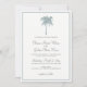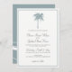 Invitaciones De Boda De Destino De La Palmera Tropical Azul Dusto Con Olas Del Océano En La Parte De Atrás. Elegante tarjeta de invitación para bodas en la playa