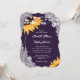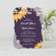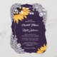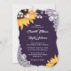 Esta elegante y romántica invitación a una boda floral con girasoles en un marco de madera de granero y encaje es perfecta para invitar a sus invitados a su rústica fiesta de bodas moradas inspirada en los girasoles. Plantilla fácil de personalizar. Diseño de personalizable completo.