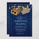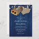 Rústica invitación a bodas florales con dos corazones burlap sobre un fondo de madera granero adornado con girasoles. Diseño perfecto para invitar a sus invitados a su fiesta de bodas rústica azul marino.