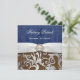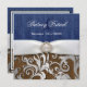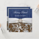 Invitaciones a la boda occidental de Cuero y Denim Damask: coincide con las tarjetas RSVP y más abajo en esta página. Cada invitación tiene una impresión de damasco de hoja floral en gradiente plateado sobre un fondo de cuero marrón impreso. En la parte delantera y trasera también hay una banda blanca impresa con un decorado de diamante. Estas invitaciones a bodas están fijadas a un stock de tarjetas básicas de alta calidad; sin embargo, puede cambiar el material a lino, fieltro (grabado en relieve), reciclado y varios matices metálicos si desea bajo el número 2 (elija su estilo, tamaño y tipo de papel) debajo del botón naranja añadir al carro. También se muestra en esa opción una lista de los costos adicionales de las existencias de tarjetas más elegantes. Cada invitación incluye un sobre blanco.