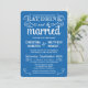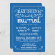 Coma, bebe y cásate — Viñetas rústicas invitaciones a bodas rurales al estilo vintage — Deslizamientos rápidos y ondulados y tipografía de moda antigua en un deslumbrante texto blanco sobre fondo azul celeste ultramarino del Océano Pacífico. Añade los nombres de novias y novios e información de bodas en esta plantilla fácil de usar. Elegante pero divertida y caprichosa caligrafía de estilo tiza escrita a mano retro puede ser modificada para su tema formal o semiformal de boda. El moderno estilo informal es perfecto para bodas contemporáneos de moda con un toque divertido de encanto sofisticado para las parejas tradicionales. Póngase en contacto con nosotros para obtener ayuda sobre la personalización si necesita espacio adicional para los detalles de su boda.NOTA Se muestra en tarjetas de invitación estándar tamaño A7. Otros tamaños y estilos disponibles, junto con invitaciones a juego, sellos postales, accesorios de coordinación y favores de ducha.