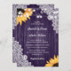 Esta elegante invitación a la boda de girasoles con girasoles y encaje rústico sobre un fondo de madera de granero es perfecta para invitar a sus invitados a su rústica fiesta de bodas moradas inspirada en los girasoles. Plantilla fácil de personalizar. Diseño de personalizable completo.