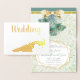 El Real Relieve metalizado dorado Peacock Pone Tipografía Invitaciones A La Boda. Relieve metalizado real en el frente y el reverso con plumas de boho y patrón floral y plumas de pavo real a todo color en invitaciones de boda.