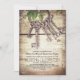 Invitación rústica a una boda rural con llaves de esqueleto. Textura de fondo de madera antigua y plantas de campo, hojas y ramas. Invitación perfecta para su boda en el bosque, boda de granero o boda vintage con un diseño rústico de antaño.