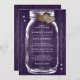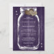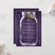 Invitación a una boda púrpura rústica con un frasco de albañil y corazones de burrega sobre un fondo de madera de granero.