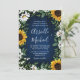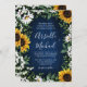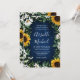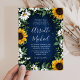 Las invitaciones a la boda rústica del girasol azul marino presentan un fondo de madera de granero azul marino adornado con margaritas acuarelas, girasoles, vegetación, aliento de bebé y lirio del valle.