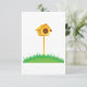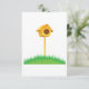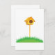 Este diseño es una casa de aves. La casa de pájaros está en un poste en medio de un parche de hierba verde. Este diseño de la casa de pájaros se ve genial en esta invitación