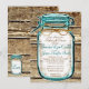 Invitaciones a la cena rústica de la casa rural Mason Jar, con un acento azul verde azulado en el fondo de un granero impreso para un tema rústico boda.