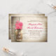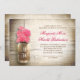 bello fondo rústico de madera y tarro de albañilería con flores rosadas para el ensayo de invitaciones a la cena. Sugiero un hermoso papel de textura de lino para este diseño.