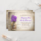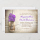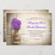 bello fondo rústico de madera y tarro de albañilería con flores moradas ensayan invitaciones a la cena. Sugiero ropa de cama o papel de fieltro para este diseño.
