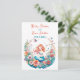 Una pequeña sirena de bonito en una cama de flores acuarela ilustracion chica invitaciones a la ducha para bebés. Los colores utilizados son rosa, coral, naranja, amarillo y azul.