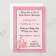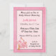 Invitaciones a los chicas para una ducha de bebé. El diseño tiene una cigüeña que lleva a una niña. Utilice una plantilla sencilla para agregar su información a esta invitación rosa.