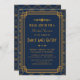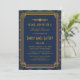 Estas invitaciones a la ducha de matrimonio tienen una paleta de colores azul y dorado, un marco geométrico, motivos geométricos y otros detalles estilísticos inspirados en el Art Déco y los años veinte. Puede personalizar los campos de texto de ejemplo a su gusto.
