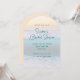 Invitaciones a la ducha de novias de Ocean sunrise. El texto azul-verde se imprime sobre una escena oceánica con un amanecer dorado. Agregue toda la información del fiesta en el formulario de párrafo agregando espacios y texto según sea necesario. El nombre de la novia y el título de fiesta están en letra de escritura moderna. Se muestra en la tarjeta de forma de arco, con otras opciones. Utilice también la opción de descarga para compartir esta invitación en línea.