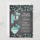 Equipamiento moderno en la cocina invitación a la ducha de novia con un pasador rodante, tazón de mezcla, espátula, picadora de pizza, whisky, molleja de verduras y cucharas de medida sobre un fondo de tiza contemporáneo con verde azulado punto de polka azul y negro. Visite nuestra tienda para ver esta invitación en una variedad de populares invitaciones a la ducha de bodas.