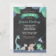 Estas encantadoras invitaciones a la ducha de bebés con temática de safari cuentan con bonitos animales de la jungla para bebés en tonos azules, verdes, tanques y morados. Los animales incluyen una jirafa, un mono, un león, una cebra y un elefante con una "ducha" de agua y corazones que vienen de su tronco. Las hojas de la jungla están por encima con un lindo cartel que anuncia "Baby Shower". La textura de fondo de pizarra añade un toque único y moderno. Neutra desde el punto de vista del género, el azul pastel y el verde funcionarían muy bien para los niños y la ducha de chica.