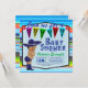 Fiesta invitación a la ducha de bebé con un lindo bebé vestido con un sombrero mexicano azul oscuro en un fondo festivo de mono multicolor. Estas adorables invitaciones a la ducha de bebé mexicana Fiesta para bebés se personalizan fácilmente para tu evento simplemente añadiendo tus detalles.