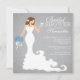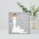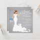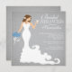 La elegante y moderna brunette invitación a la ducha nupcial de novia incluye un moderno tostado de novias con una copa de vino mientras sostiene un hermoso ramo de flores de boda azul oscuro sobre un fondo de lino gris popular impreso con texto blanco sobresaliente. Nuestra moderna invitación a la ducha nupcial es perfecta para una celebración popular de la ducha de novia. Visita nuestra tienda para ver esta hermosa invitación a la ducha nupcial en una amplia selección de colores florales y diferentes variaciones de novias.