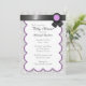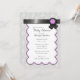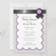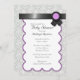 Hermosas invitaciones con un diseño de damasco gris y blanco y una cinta negra con color púrpura en la parte superior.