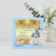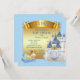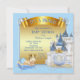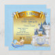Invitaciones a la ducha de bebés de príncipe azul y oro bebé con príncipe bebé dulce sobre una almohada azul bonito en un hermoso castillo azul bebé y oro y fondo de carro. Estas invitaciones a la ducha de bebé de prince adorables se personalizan fácilmente para tu evento simplemente añadiendo tus detalles.