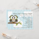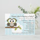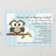 Estas adorables invitaciones a la ducha de búho personalizado con un búho marrón y verde lima colocado en una rama arbolada en un día nublado de bonito y fondo a rayas azules son perfectas para una ducha de bebé con temática de búho para que la nueva mamá espere un niño. Esta linda, moderna y moderna ducha personalizada de búho invita a decir "Adivina quién está teniendo un bebé", pero se puede personalizar decir lo que quieras. Obra de arte © Chrissy H. Estudios, LLC.Todos Los Derechos Reservados.