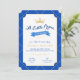 Invitaciones a la ducha de bebés de principito con oro sucio y azul real profundo. "Un Principito está en camino" seguido de todos los detalles de una ducha de bebé con temática de príncipe. ¡Las elegantes esquinas son perfectas para un evento real de este tipo! En la parte trasera hay un patrón de corona dorada y azul.