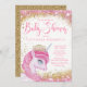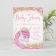 Chicas unicornio invitaciones a la ducha de bebé con adorable unicornio de princesa rosa sobre un hermoso fondo rosa y dorado. Estas lindas invitaciones para una ducha de bebé unicornio se personalizan fácilmente para tu evento simplemente agregando los detalles de tu evento. Se trata de un diseño impreso sin purpurina, joyas, etc.