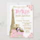 Invitación a la ducha de bebé en París con la hermosa Torre Eiffel de oro, elegantes paquetes de regalo de París rosados y dorados, niña dulce con traje rosado y una cuerda de perlas, elegante escritura París rosada con fondo floral rosa bonito. Esta hermosa invitación a la ducha de bebé en París se personaliza fácilmente para tu evento simplemente añadiendo tus detalles en el estilo de letra y color, y la redacción de tu elección. Se trata de un diseño impreso sin diamantes de verdad, joyas, purpurinas, etc.