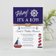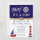 ¡Ahoy es un chico! Esta preciosa ducha de bebé tiene un tema náutico y cuenta con un faro, un velero y una silla de ruedas en un estilo marino, rojo y blanco.