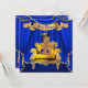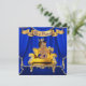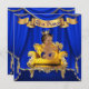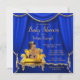 Invitaciones a la ducha real azul y dorada para bebés con un adorable bebé étnico que usa un pañal azul real y una corona azul y dorada en una hermosa silla azul real y dorada y fondo de cortina. Estas invitaciones a la ducha de bonito azul real y oro para bebés son fácilmente personalizares para tu evento simplemente agregando tus detalles en el estilo de letra que prefieras.