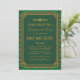 Las invitaciones a las fiestas de soltero tienen una paleta de colores verde y dorado, un marco geométrico, motivos geométricos y otros detalles estilísticos inspirados en el Art Deco y los años 2000. Puede personalizar de los campos de texto de ejemplo a su gusto.