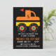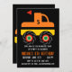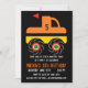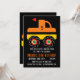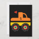 Un gran naranja genial y un camión monstruo amarillo con la edad de su hijo en la plantilla de la fiesta de cumpleaños del personalizado de la puerta. Rellene los detalles del fiesta para esta invitación personalizada.