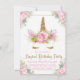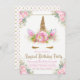 Invitaciones a la fiesta de cumpleaños de Unicorn con cara de unicornio floral dorado y rosa dulce con pestañas doradas y cuerno floral sobre un hermoso fondo floral rosa y dorado. Esta dulce invitación a la fiesta de cumpleaños de unicornio se personaliza fácilmente para tu evento simplemente añadiendo tus detalles. También puede cambiar el color de fondo de esta adorable invitación de unicornio. Este es un diseño impreso sin ningún purpurina real.