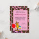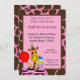 Invitaciones coloridas a la fiesta de cumpleaños de la jirafa con un fondo de jirafa rosa y marrón. Esta tierna jirafa tiene un globo rojo y un cono de helado apilado alto