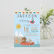 Invitaciones a fiestas de cumpleaños de pesca con adorable oso de bosques y pesca de conejo en un bote sobre un fondo de lago de montaña en la parte delantera y diseño de agua en la parte trasera. Todas estas invitaciones a fiestas de cumpleaños de pesca se personalizan fácilmente para tu evento simplemente agregando tus detalles. También puede cambiar el color de fondo de estas adorables invitaciones a fiestas de cumpleaños de pesca.