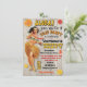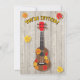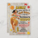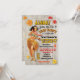 Las invitaciones a la fiesta de cumpleaños de Luau Luau son muy divertidas, con un chica hula vintage y flores de hibisco sobre un fondo de madera templada. En la parte trasera hay una ukelele de madera.