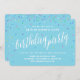 Invitaciones para un tema de la fiesta de cumpleaños de Sprinkle. Con papel azul bonito para un fondo divertido y colorido, y rociadores de arcoiris cayendo como confeti alrededor de la caligrafía del guión "fiesta de cumpleaños". Para más ideas de fiestas aspersores, consulte nuestra colección de Fiestas aspersores. ¡Un tema perfecto para la fiesta de cumpleaños de cualquier niño que anhela rociar!