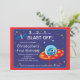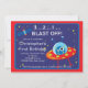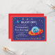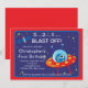 Comienza tu fiesta de cumpleaños con nuestros adorables invitados de cumpleaños en el espacio exterior con una explosión de cohetes con planetas colocados en un fondo azul cielo con estrellas con fondo de marco rojo. Agradable para tu fiesta de cumpleaños de chicos con temática espacial. Visite nuestra tienda para ver otras invitaciones de cumpleaños de barcos del espacio exterior y notas de agradecimiento, pegatinas y sellos postales. © Blackleaf Designs