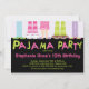 La invitación del partido Cute pajama para chicas incluye el clíparte más lindo de los pies de pajama, incluyendo los pies de pajama con zapatillas de conejo, los pies de pajama con zapatillas de perrito y los pies de pajama con medias. La popular invitación a dormir para una fiesta de cumpleaños de chicas está ambientada en un fondo negro de moda con una fuente rosa caliente y verde lima. Disponible en nuestra tienda en diferentes tamaños.