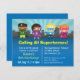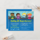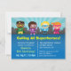 Planee un fiesta de superhéroes e invite a los invitados de sus hijos a venir vestidos con los disfraces, gorras y máscaras de sus superhéroes favoritos o a usar sus mentes creativas para idear sus conceptos originales de superhéroes. Esta invitación tiene niños lindos vestidos con trajes de superhéroes, con máscaras y capa. Un horizonte urbano y una explosión de sol azul decoran el fondo. Ideal para los niños que aman los temas de los superhéroes o se visten de fiestas. Personalice fácilmente con detalles del fiesta.