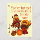 Una adorable invitación a la fiesta de cumpleaños de calabaza con unas espantapájaros y calabazas lindas y flores y hojas de otoño. Personalizar con sus propios detalles de la fiesta de cumpleaños. También puede usar esto para cualquier fiesta de cumpleaños de otoño o otoño o invitación al evento. Simplemente cambie la redacción de la plantilla a la suya.