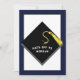 Creativa fiesta de graduación invita a la clase de graduación 2025 con gorra negra y tacón dorado sobre fondo azul marino.