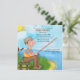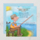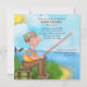 Tema de la pesca divertida Invitaciones a la fiesta de retiro con el cielo azul, el fondo del lago y el paisaje de la hierba y el hombre sentado en un tronco con su barra de pesca, caja de abordaje y cebo. Este diseño único es perfecto para un hombre que se retira. Nombre, fecha, ubicación y texto RSVP está listo para que el cliente pueda personalizar con su información.